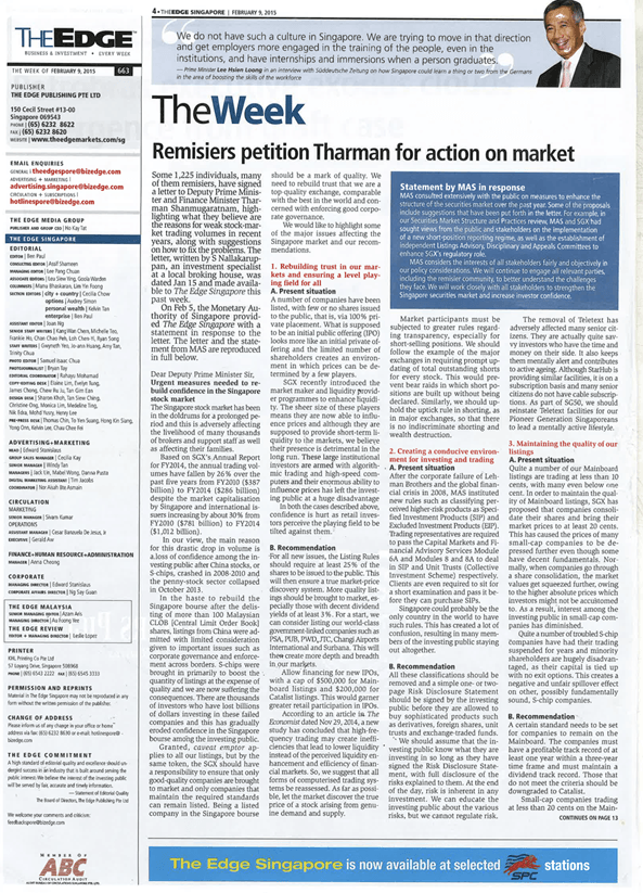 Mr Lawrence Loh Kiah Muan had written a letter to The Straits Times Forum Page that was published today (15th Feb 2022) urging the Singapore Exchange to rejuvenate the Singapore market which has been in the doldrums for too long a time.